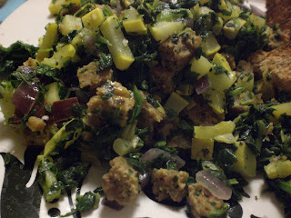 For dinner tonight, I attempted to re-create the White Bean and Walnut Bruschetta I made a few months ago. The ED&BV recipe calls for tomatoes and walnuts, however, neither of which I happened to have on hand. Improvisation came into play, and I substituted almonds for the walnuts and red onion for the tomato. These alteration produced a decidedly different flavor, although I enjoyed it, nonetheless. Along with it, I had some yellow squash, a salad with my new favorite dressing (mustard/vegan mayo/agave nectar/lemon juice/dill weed). A nice dish of applesauce finished it off. Whew! Lots of food, but I needed it.